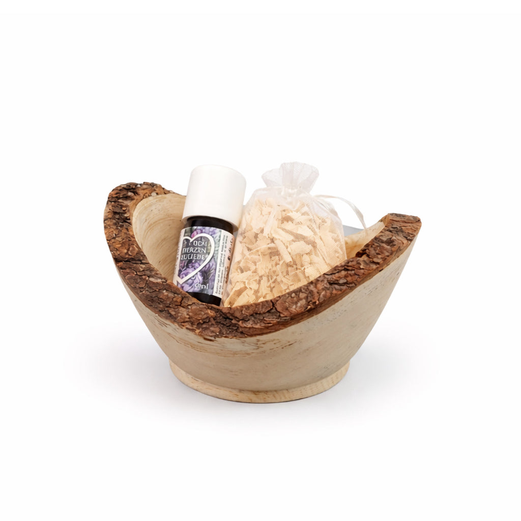 This turned Swiss pine bowl, crafted from genuine Tyrolean Swiss pine, combines a natural look with a soothing fragrance. Each bowl is made of solid Swiss pine and features a unique grain pattern, giving the set its distinctive character. Combined with the natural Swiss pine shavings, the bowl instantly releases a pleasantly warm Swiss pine scent into the room – ideal for bedrooms, living rooms, or workspaces.