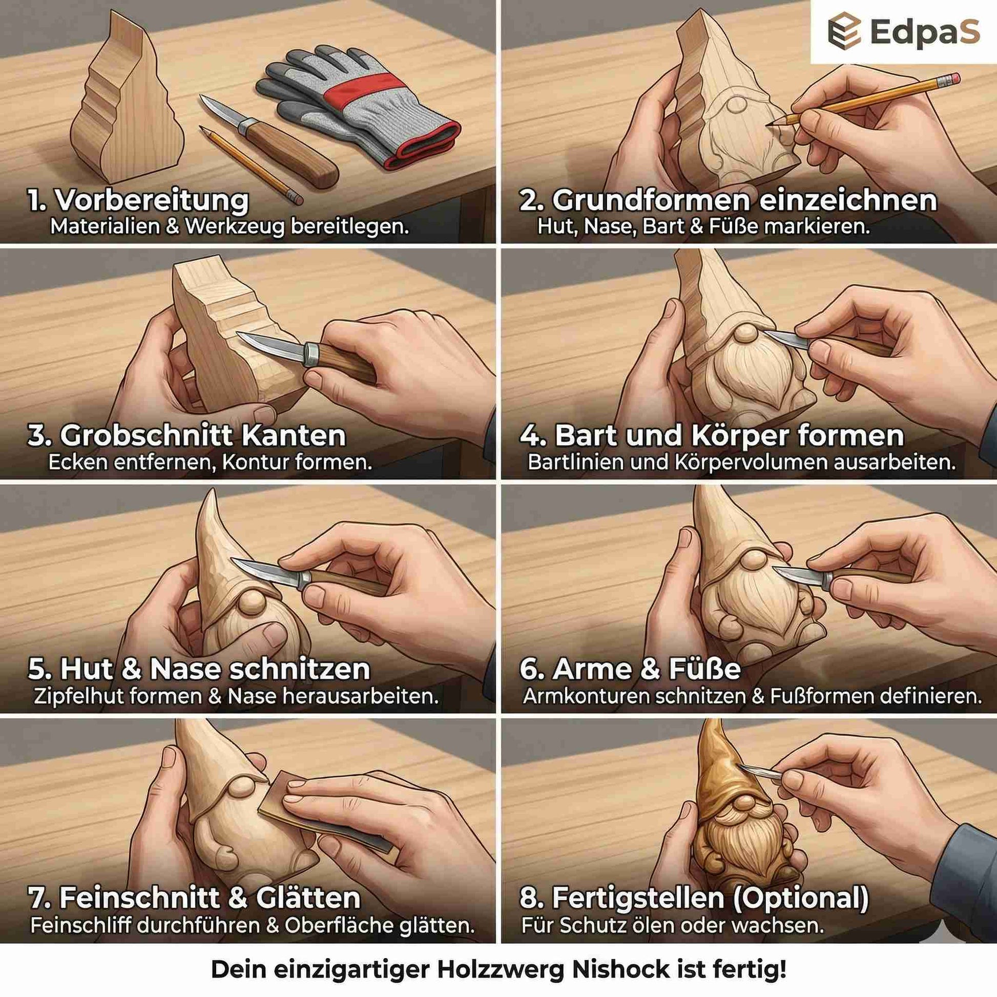 Das Lindenholz lässt sich dank seiner weichen Struktur leicht bearbeiten und ermöglicht saubere Schnitte sowie kreative Verzierungen. Das Schnitzen einer Zwergfigur fördert sowohl Technik als auch Fantasie und bietet eine spannende Herausforderung, die Spaß macht und die Fähigkeiten schult.