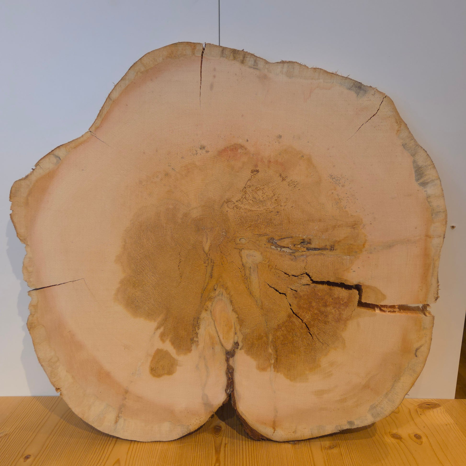 Naturbelassene Baumscheibe aus Zirbenholz, mit einem Durchmesser von ca. 60 cm und einer Stärke von 4 cm. Die Oberfläche ist plangefräst und fein geschliffen, wodurch sie sofort weiterverarbeitet oder dekorativ eingesetzt werden kann.
